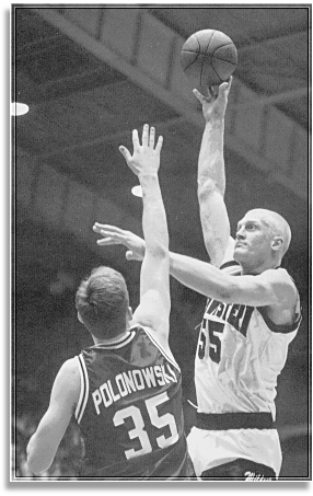 Contrary to what some may think, when two players exchange words on the court, it isn't always to harass the other or to "get in his head." I've always liked battling against players I've met outside of the arena (Jamie ran into me last spring at Johnny Rockets in Chicago) and this was no exception. I had a similar relationship with Penn State's John Amaechi (he and I corresponded via e-mail on several occasions) and we always greeted each other before John beat me like a red-headed stepchild. It just seems more fun for some reason; I don't know why but it just does. The only thing I was not looking forward to was guarding Jamie out on the 3 point line. I hate defending 3-point shooters period, and from our scouting reports it was all too clear that Jamie had pretty much given up the post for higher grounds.