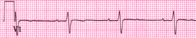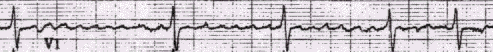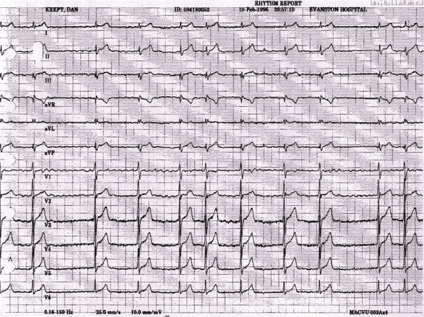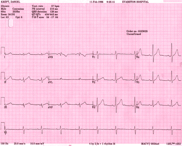 All in all I think I had something like 15 wires coming off of me--it was pretty funky. The plot above shows perhaps the clearest example of both the atrial fibrilation as well as my irregular heart rate. Note the irregularly spaced QRS complexes (the big spikes where the ventricles contract) and the jagged traces between these complexes. Compare that to the ECG (below) of me the morning after. Pretty funky, eh?