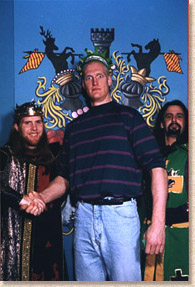 After checking the place out, the crowd was escorted into sections surrounding a huge sandy arena where the games would be played. We were seated in the green section. As we all shoveled whole baked chickens into our faces (I had two, actually, Joe had 1 1/2) we watched a bunch of fools dressed in medieval gear beat the snot out of each other with maces, swords, whips and the whole nine yards. We all had a great time cheering on our knight (the green knight) who was cast as the "ruthless bastard" (their words, not mine) of the show. And did he ever live up to his billing! He was about as pleasant as Bobby Knight on a bad hair day). Joe, a football player, and I had a blast harassing the other knights at the tops of our lungs, totally embarassing our respective dates. That's okay, we didn't care. After all, we're jocks--we're supposed to be rude and obnoxious during sporting events, or whenever else we get the chance. =-)